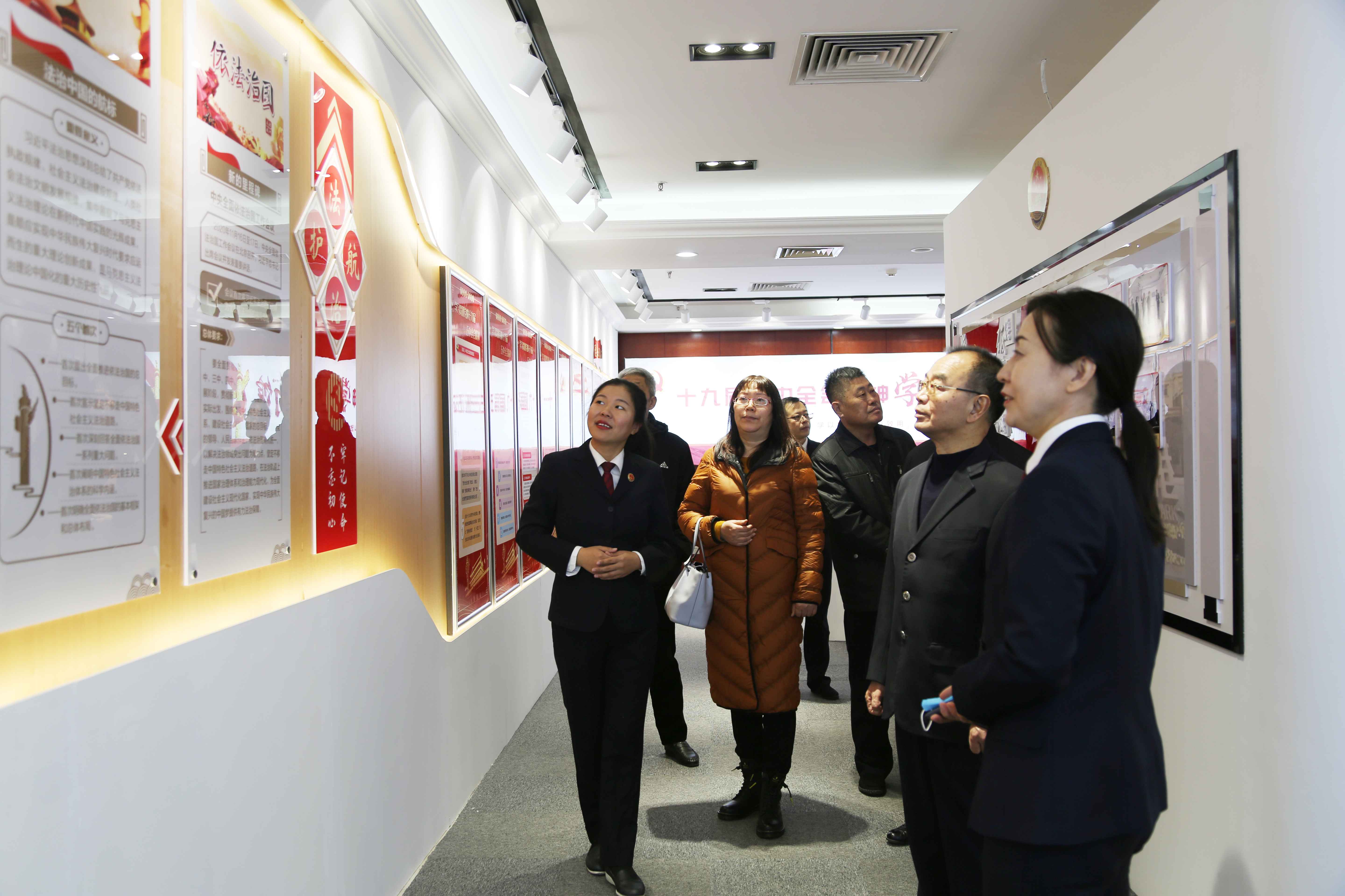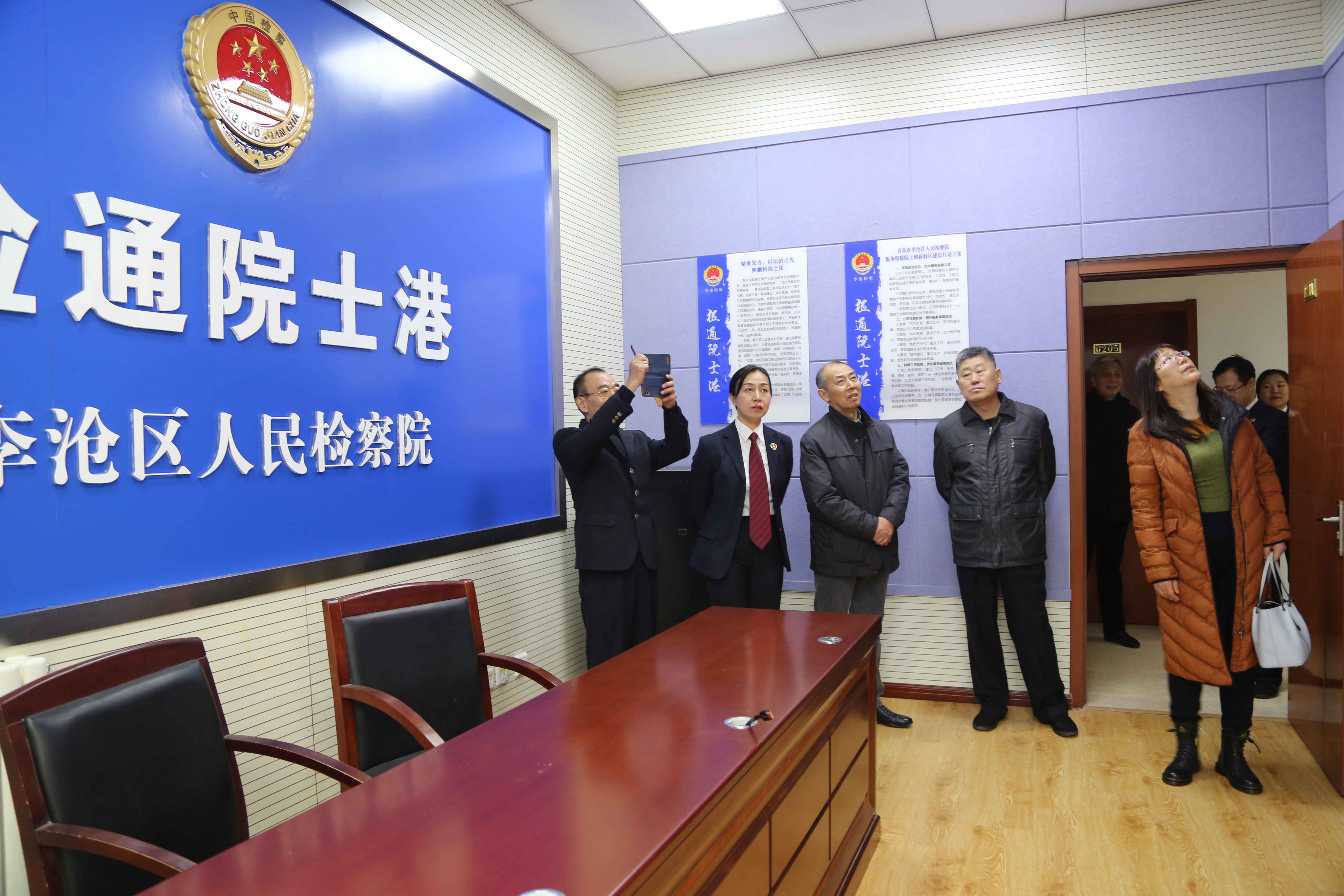 荣退人员参观李沧区人民检察院政治理论学习馆、12309检察服务大厅、检察长接访室等工作室。